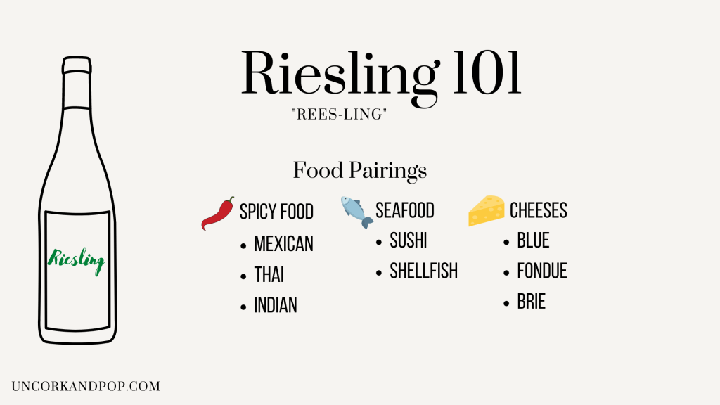 As mentioned above, Riesling does well with spices because of its slight sweetness and high acidity, it balances the flavors in the dish. But it’s a wine that is very versatile and chicken, seafood (especially sushi), pork, duck, and roasted vegetables that display natural sweet flavors like peppers, squash, and carrots are great pairings as well. As for cheeses, goat cheese, brie, and blue cheese are all great options.